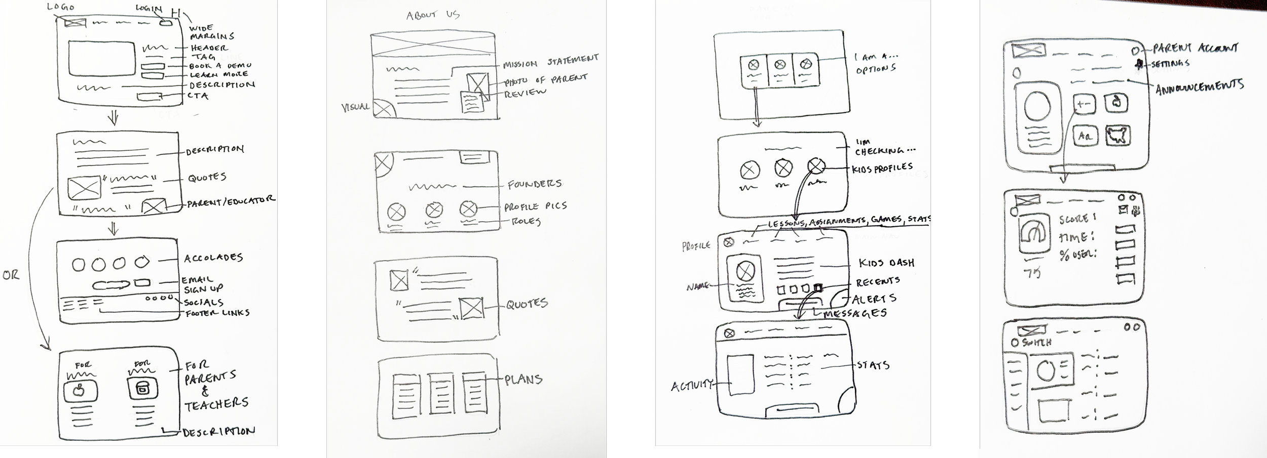 For the portal I sketched out ideas of what it would look like to choose between users, select different students who the user would be checking in on, and educational metrics that could be represented in an accessible and legible way.