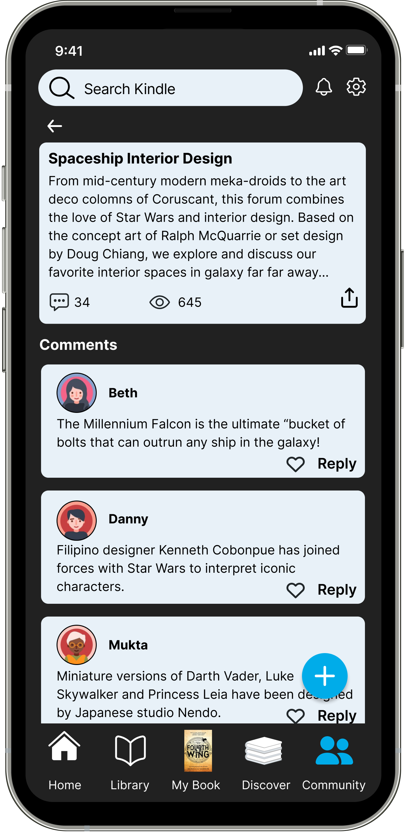 Reading can be isolating. Mostly done alone, a reader often seeks out book clubs or social groups to discuss their books or plays with others. In our case study, users wanted a way to interact with other book lovers on the Kindle app without compromising their core reading experience.