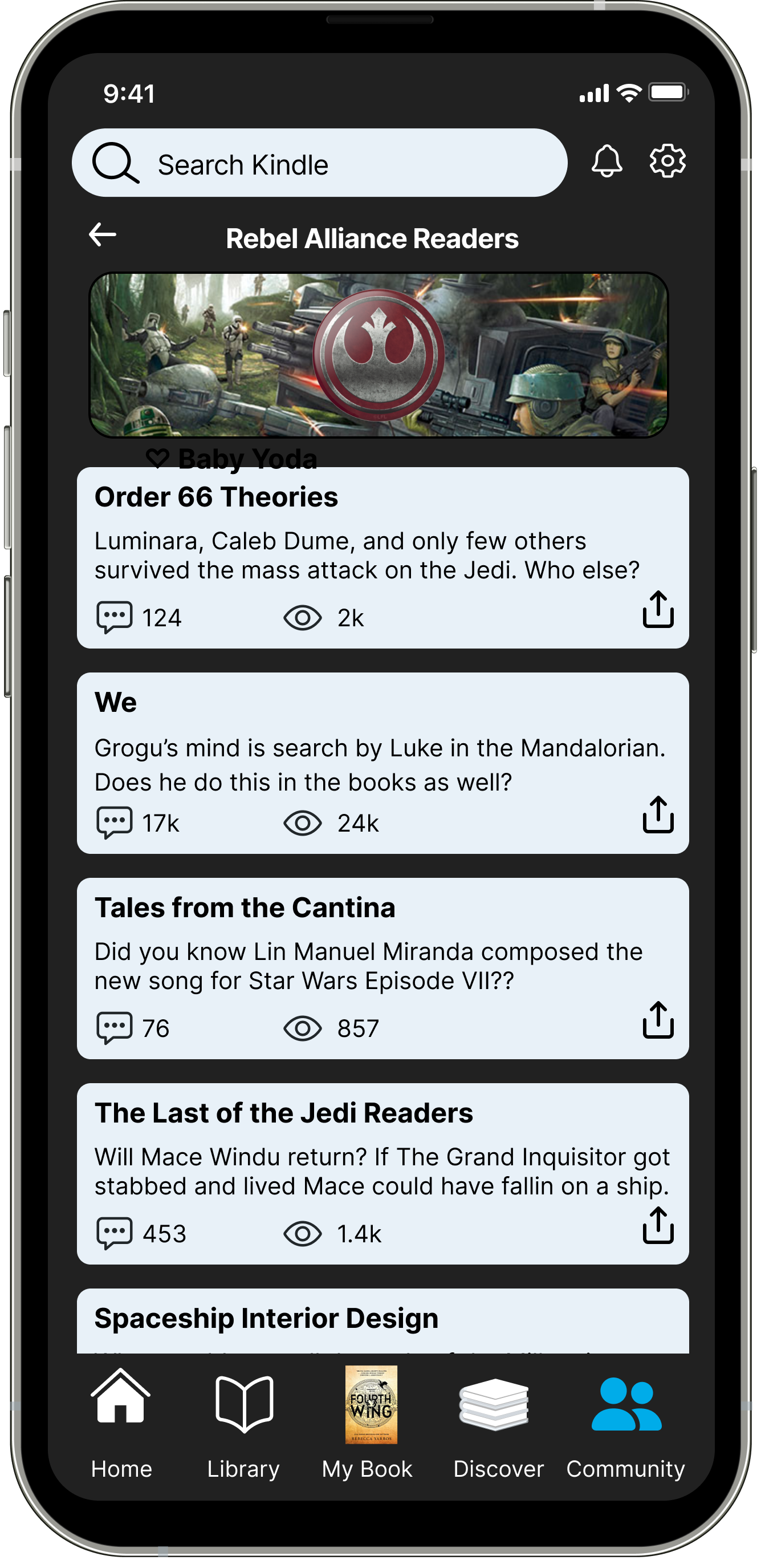 I created the homepage library contect as well as microcopy for the comments left in the discussion feed. I selected and arranged profile avatars and collaborated in the typography decisions, the scale of icons, and was the instigator of designing in dark mode for better accessibility that matched the real world product. .